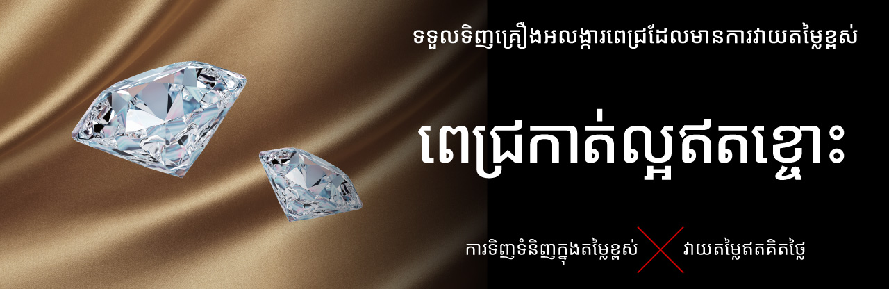 **ពេជ្រ**ត្រូវបានទិញពីអតិថិជនរាប់ពាន់នាក់ជារៀងរាល់ថ្ងៃនៅតាមសាខា **Jewel Cafe** ទូទាំងប្រទេស។ ខាងក្រោមនេះជាឧទាហរណ៍មួយចំនួននៃ**ពេជ្រ**ដែលយើងខ្ញុំបានទិញ។ ប្រសិនបើលោកអ្នកមានចម្ងល់ណាមួយ សូមកុំស្ទាក់ស្ទើរក្នុងការទាក់ទងមកយើងខ្ញុំ។ ប្រសិនបើអ្នកមិនច្បាស់ថាអាចលក់វាបានឬអត់ទេ សូមទាក់ទងមកយើងខ្ញុំជាមុនសិន។